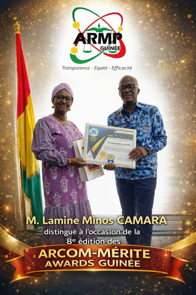 C’est dans cet esprit que, lors de la 8ᵉ édition des ARCOM-MÉRITE AWARDS GUINÉE, une distinction de haute portée a été décernée à M. Lamine Minos Camara, Directeur Général de l’Autorité de Régulation des Marchés Publics (ARMP).