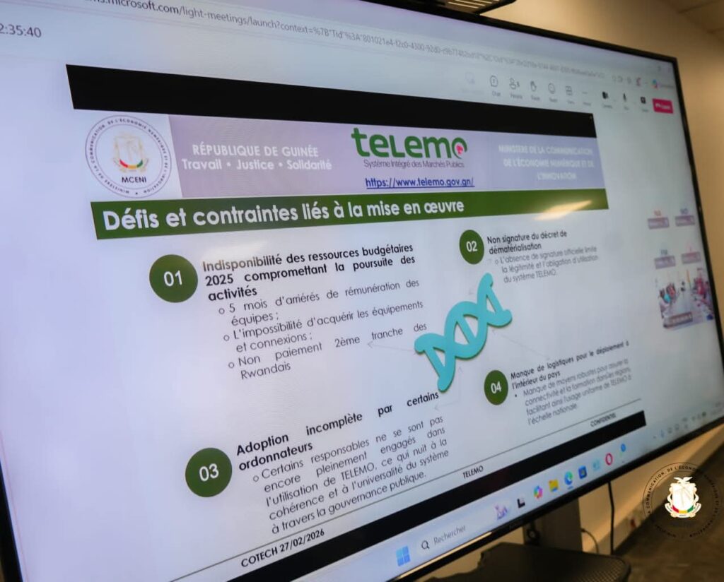 Les cadres techniques et les principales parties prenantes du projet TELEMO se sont réunis le vendredi 27 février 2026 au ministère de la Communication, de l’Économie numérique et de l’Innovation afin de faire le point sur l’état d’avancement du déploiement de cette plateforme numérique dédiée à la gestion des marchés publics en Guinée.